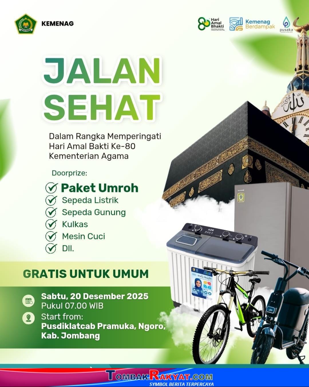 TombakRakyat.com, – JOMBANG – Kabar gembira bagi masyarakat Jombang dan sekitarnya. Dalam rangka memperingati Hari Amal Bakti (HAB) ke-80, Kementerian Agama Kabupaten Jombang akan menggelar Jalan Sehat Gratis untuk Umum dengan deretan doorprize menarik, mulai dari paket umroh hingga sepeda listrik.